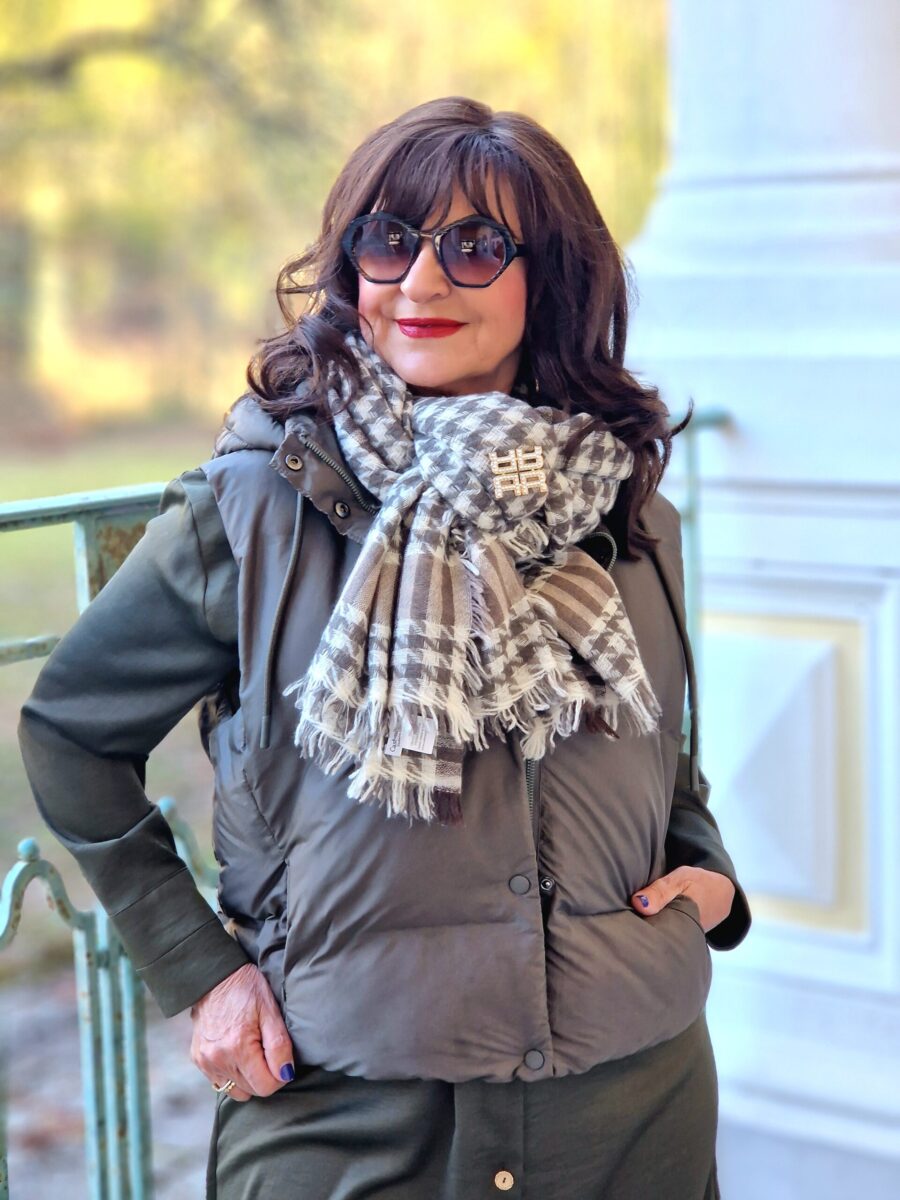 Heute greife ich zu einer Farbe, die ich wirklich nur einmal im Kleiderschrank vorrätig habe – Olive. Als ich mich für dieses Outfit entschieden habe, hat mich die vorteilhafte Schnittführung des Kleides überzeugt. Gleichzeitig wollte ich einfach mal etwas ganz anderes ausprobieren. So kam mir die Idee, das Kleid mit einer kürzeren Steppweste zu kombinieren.