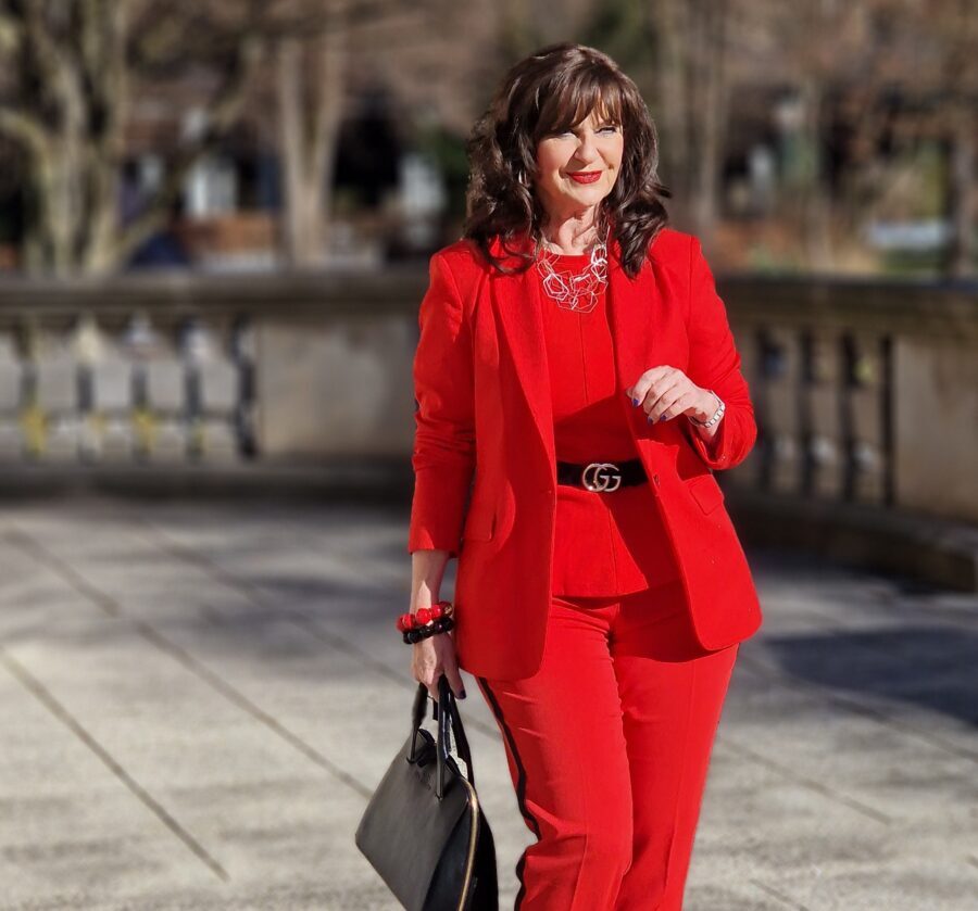 Ein gut durchdachter Kleiderschrank kann den morgendlichen Stress minimieren. Beginnen wir die Woche mit einem Power-Look: Ein roter Hosenanzug kombiniert mit einem roten Blusenshirt.