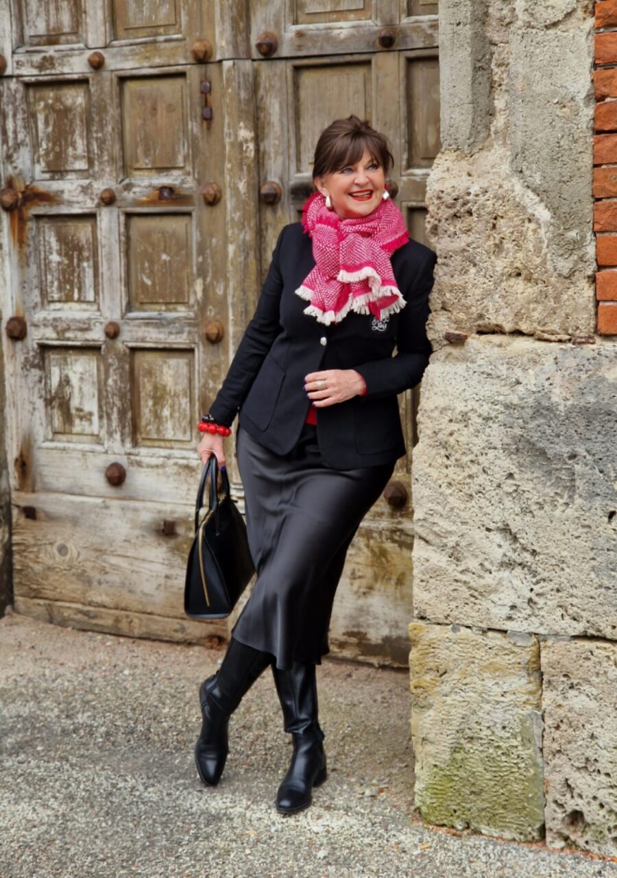 wieder eins schöner als da andere! Ich kann mich schwer entscheiden, was mir am besten gefällt. Vielleicht der Satin-Rock mit den flachen Stiefeln. Ich habe vom letzten Winter einen weiten, längeren, den ich ganz ähnlich kombiniere wie auf dem Foto mit schwarzem Oversize-Rolli, dazu ein silberner Gürtel und ebensolche Kette. Zu meiner Haarfarbe passt Silber einach am besten…