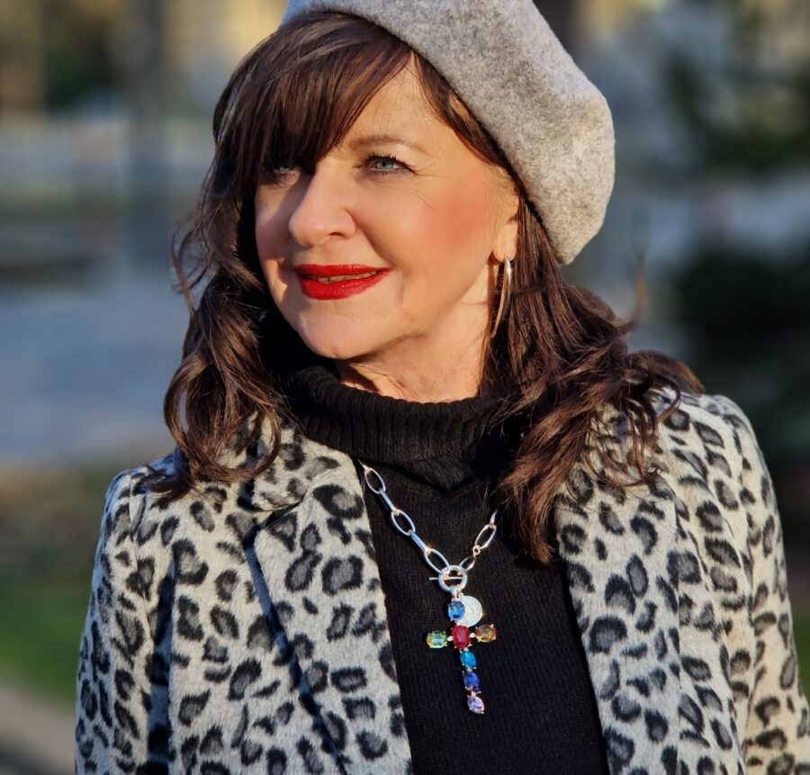 Der Mantel im Leoprint in grau ist der Hauptteil des 7. Looks für den Februar. Darunter kombiniere ich einen schwarzen Rollkragenpullover. Ein silberfarbiger Gürtel ist ein kleiner Eyecatcher. Die Kreuzkette gehört zu meinen neuen Schmucklieblingen, die ich auf der Messe in Salzburg gekauft habe.