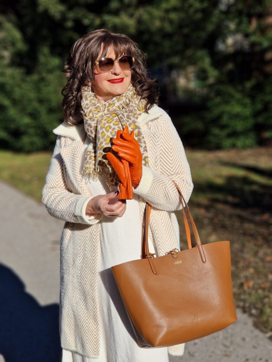 Einen farblichen Akzent setze ich mit den Handschuhen, dem Cashmere-Schal und dem Shopper. Ein Look für viele Gelegenheiten.
