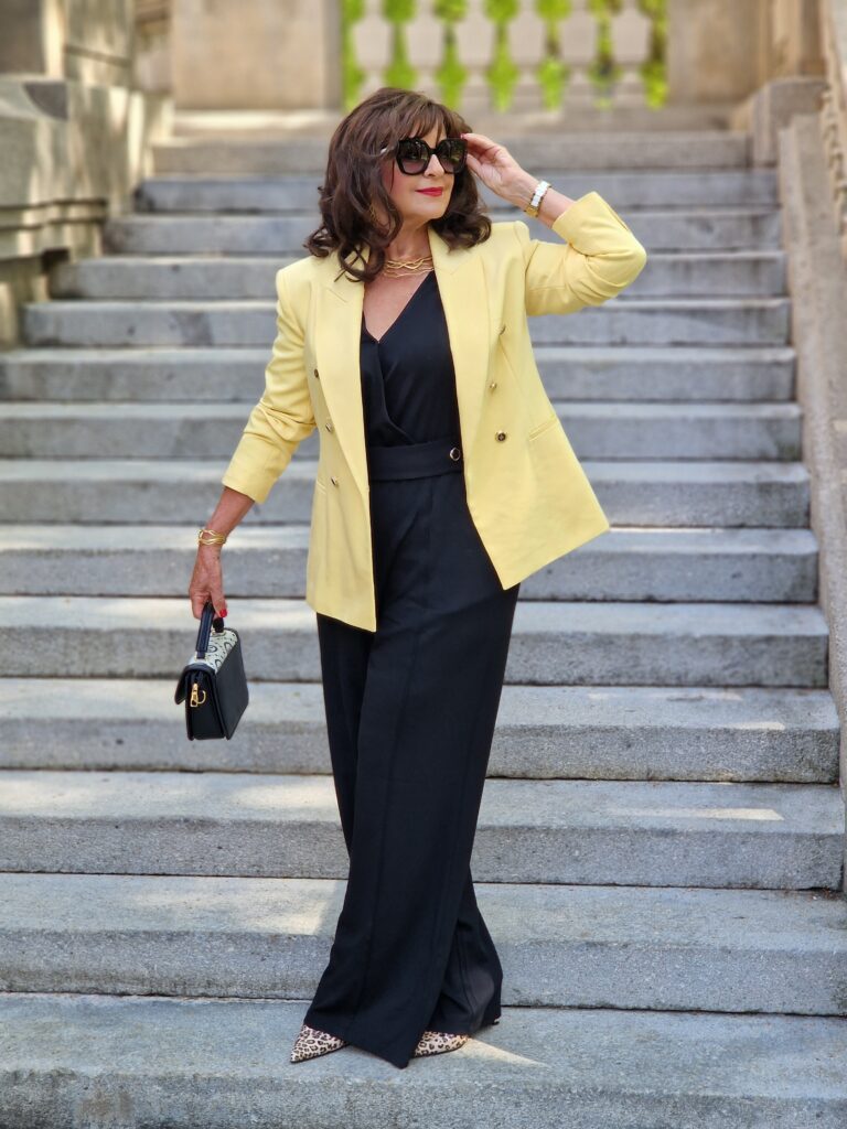 Das ist eine superschicke Kombi – gelber Blazer und dunkelblauer Jumpsuit – 10 Punkte!