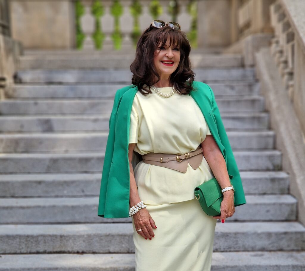 Der Dienstag ist feminin und ein echter Hingucker. Der gelbe sommerleichte Strick-Zweiteiler ist ein Glücksgriff, den ich bei ZARA in Salzburg gekauft habe. Der grüne Blazer bringt Frühlingslaune ins Spiel. Inspiriert von der Natur habe ich Gelb und Grün zusammen kombiniert.