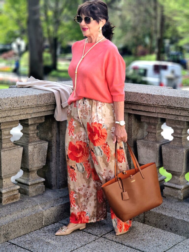 Der Freitag bringt florale Leichtigkeit und eine entspannte Farbkomposition. Die weite Hose mit Blumenmuster trifft auf meinen Pullover in harmonischen Tönen. Die Hose bietet so viele Kombinationsmöglichkeiten, das hat mich auf dem ersten Blick begeistert. Mein Blazer ist in leichten Beigetönen gehalten, der die Basisfarbe der Hose widerspiegelt.