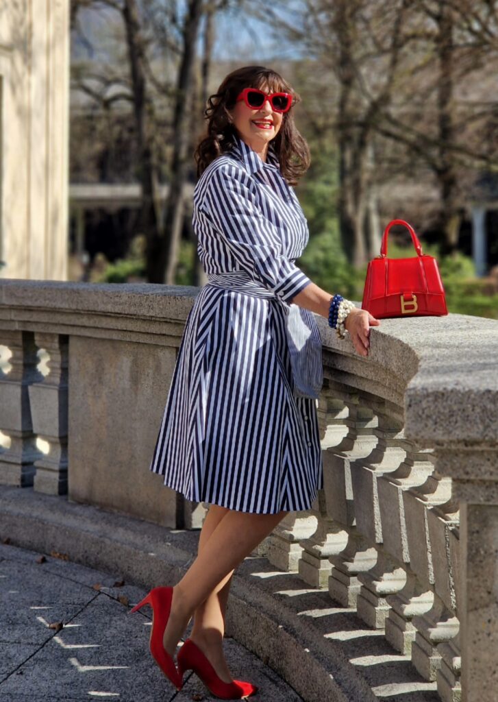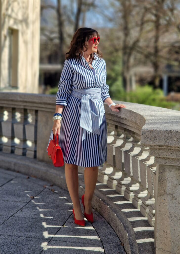 - Die Accessoires habe ich in Rot gewählt. Ein toller Kontrast zu den blau-weißen Streifen. Selbstverständlich wäre eine blaue Handtasche und blaue Pumps ebenfalls eine stilvolle Kombination. Der weiße Blazer ist für den formelleren Anlass ein guter Begleiter. Wer es lässiger mag, macht mit einer schicken Jeansjacke, in blau oder weiß, alles richtig.