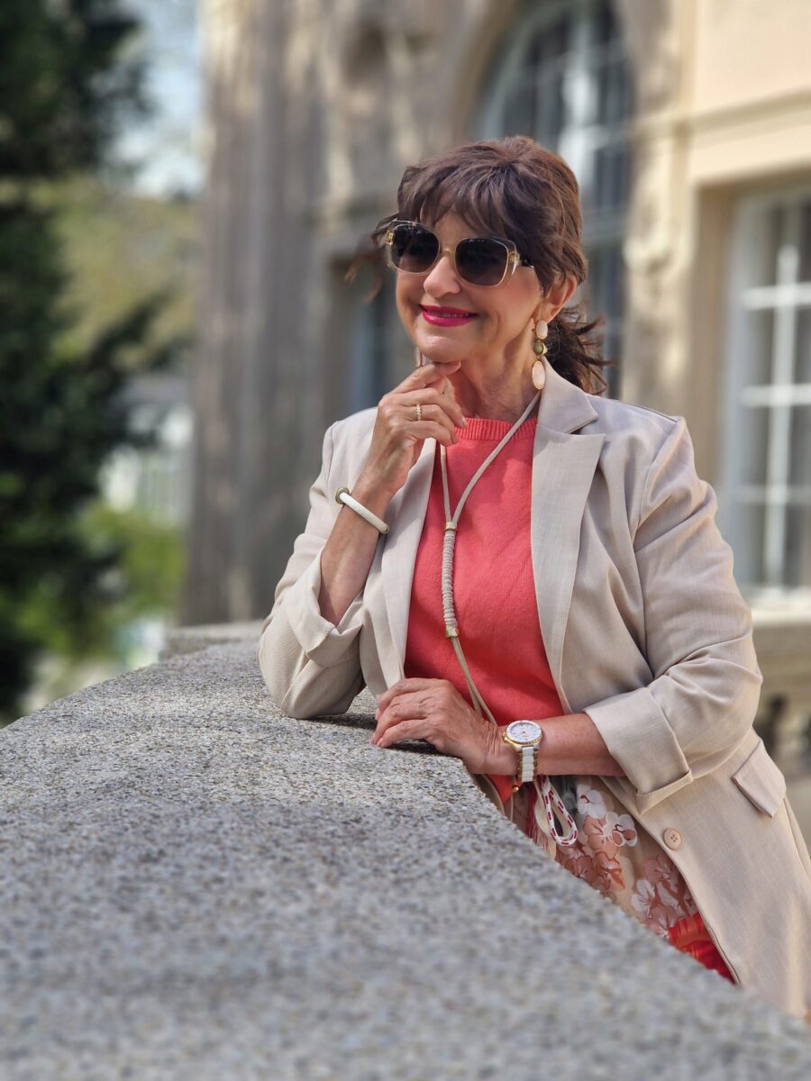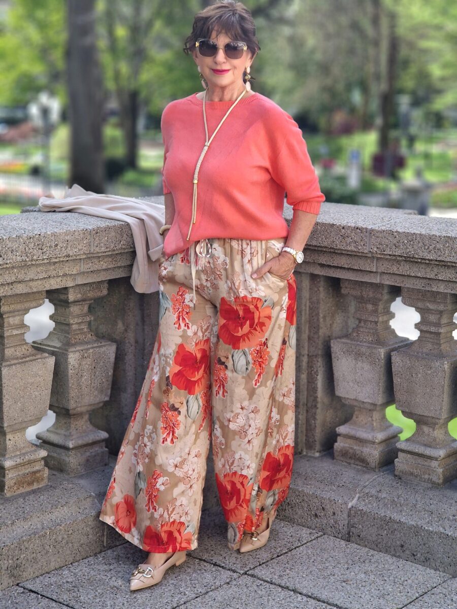 Der Freitag bringt florale Leichtigkeit und eine entspannte Farbkomposition. Die weite Hose mit Blumenmuster trifft auf meinen Pullover in harmonischen Tönen. Die Hose bietet so viele Kombinationsmöglichkeiten, das hat mich auf dem ersten Blick begeistert. Mein Blazer ist in leichten Beigetönen gehalten, der die Basisfarbe der Hose widerspiegelt.