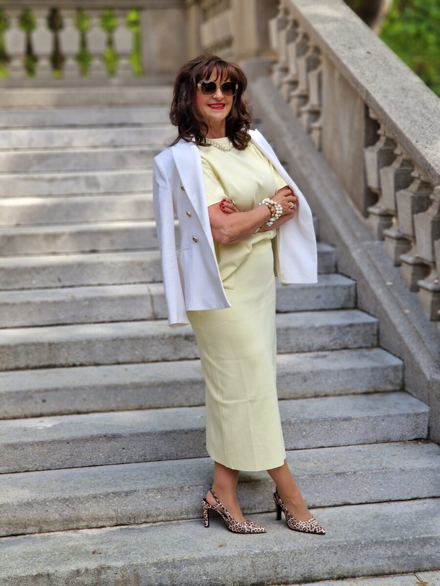 auch heute wieder eine richtig tolle Kombinations-Parade zur Farbe „Buttergelb“, Besonders gefällt mir die Präsentation mit dem erfrischenden Grün mit Blazer, Pumps und Tasche., aber auch die Zusammenstellung mit dem weißen Blazer und den Sling-Pumps im „Leoparden-Look“ sieht sehr edel aus.