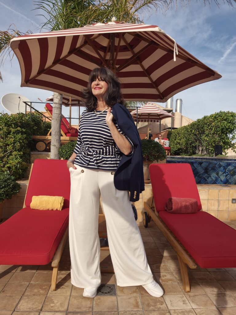 - Für einen stilvollen City-Tag eignet sich mein weißer Zweiteiler hervorragend. Die Struktur des Materials ist luftig und leicht. Die Schlupfhose ist so bequem und mit einem Tunnelzug, ohne Knöpfe, ohne Reißverschluss. Eine große Tasche wollte ich an diesem Tag nicht mitnehmen. Ich hatte eine ganz kleine Tasche dabei, da bringe ich Handy, Geldbörse und Zimmerkarte unter. Rucksäcke sind für mich das absolute No-Go, außer wenn ich zur Wanderung gehe.