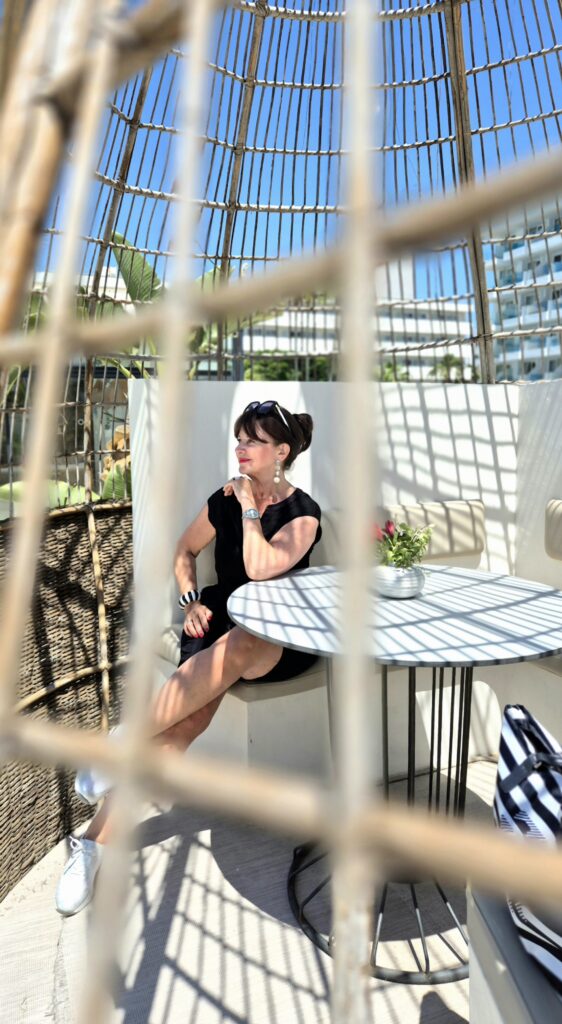 - Mein schwarzer Bermuda-Anzug ist wie geschaffen für eine elegante Lässigkeit unter Palmen. Das Oberteil besteht aus einem leichten Seidenmaterial im Vorderbereich und Viskose am rückwärtigen Bereich. Besonders schön finde ich die schwarz-weißen Accessoires dazu, die das Outfit auflockern. Meinen Shopper mit Streifen habe ich mitgenommen, da ich noch leichte Strandschuhe dabei hatte.