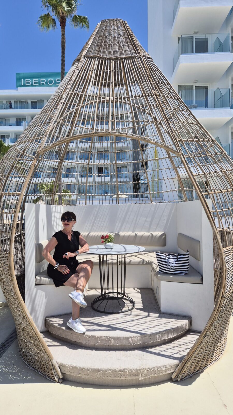 - Mein schwarzer Bermuda-Anzug ist wie geschaffen für eine elegante Lässigkeit unter Palmen. Das Oberteil besteht aus einem leichten Seidenmaterial im Vorderbereich und Viskose am rückwärtigen Bereich. Besonders schön finde ich die schwarz-weißen Accessoires dazu, die das Outfit auflockern. Meinen Shopper mit Streifen habe ich mitgenommen, da ich noch leichte Strandschuhe dabei hatte.