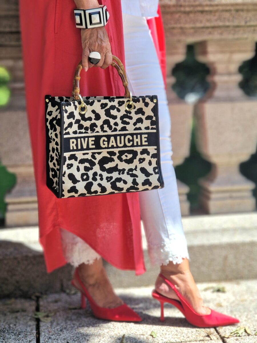 Die auffällige Tasche, die ich bei einem Frankreich-Urlaub im letzten Jahr gekauft habe, ist mehr als nur praktisch. Sie ist ein Statement mit einem außergewöhnlichen Design. Sie bringt zusätzlich Lebendigkeit ins Outfit. Taschen dürfen bei extravaganten Looks durchaus stylische Kontrastpunkte setzen.