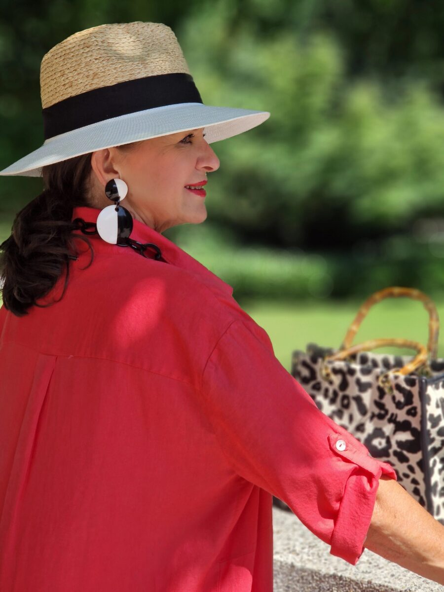 Im Mittelpunkt steht heute ein langes, lässiges Hemdblusenkleid in ROT, das ich ganz bewusst mit einer weißen Jeans kombiniert habe. Dazu einige extravagante Accessoires, die dem Outfit – wie bekannt – das gewisse Etwas verleihen. Und außer Farbe, Accessoires, interessanter Tasche und Highheels bietet der Look noch ein Extra: einen stilvollen Sommerhut. Wer damit keine WOW-Effekte erzielt, wohnt definitiv in der falschen Region.