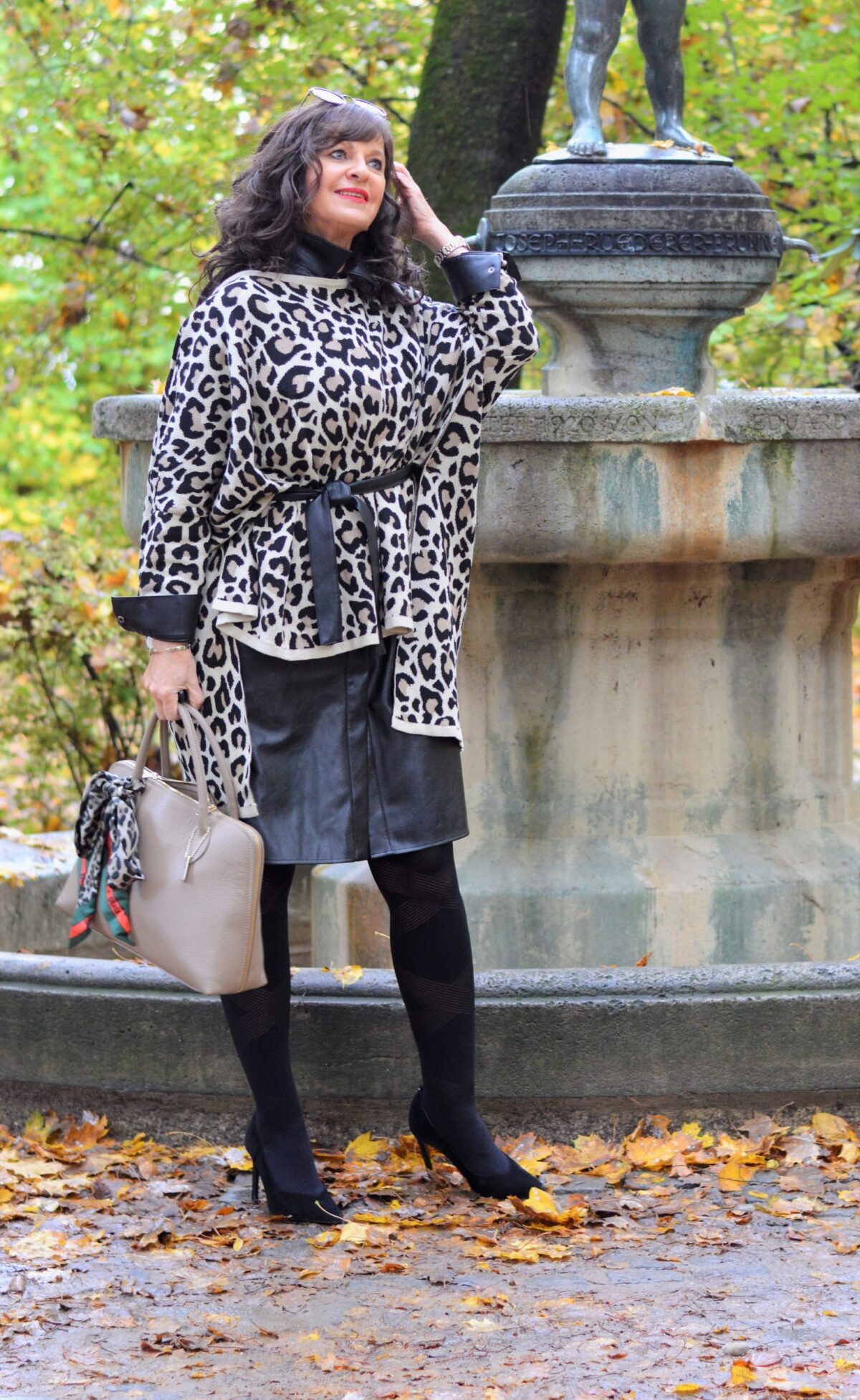 Dein Outfit ist todschick von Kopf bis Fuß, von der Baskenmütze bis zu den Stiefeletten! Der Animal-Poncho ist natürlich der absolute Hingucker. Mit Leo-Animal-Print bin ich eher zurückhaltend, davon habe ich nur eine Bluse, die ich unterm schwarzen Blazer trage, auch eine schmale Jeans, allerdings dezenter in Grau-Schwarz, sieht etwa aus wie auf dem Schwarzweiß-Foto oben.
