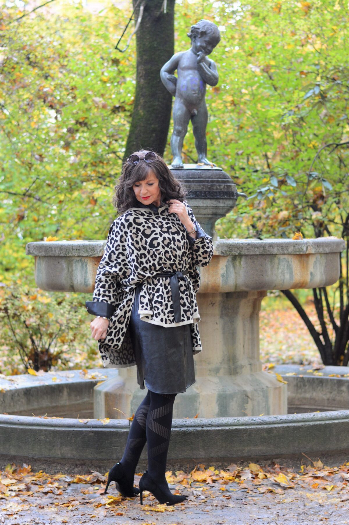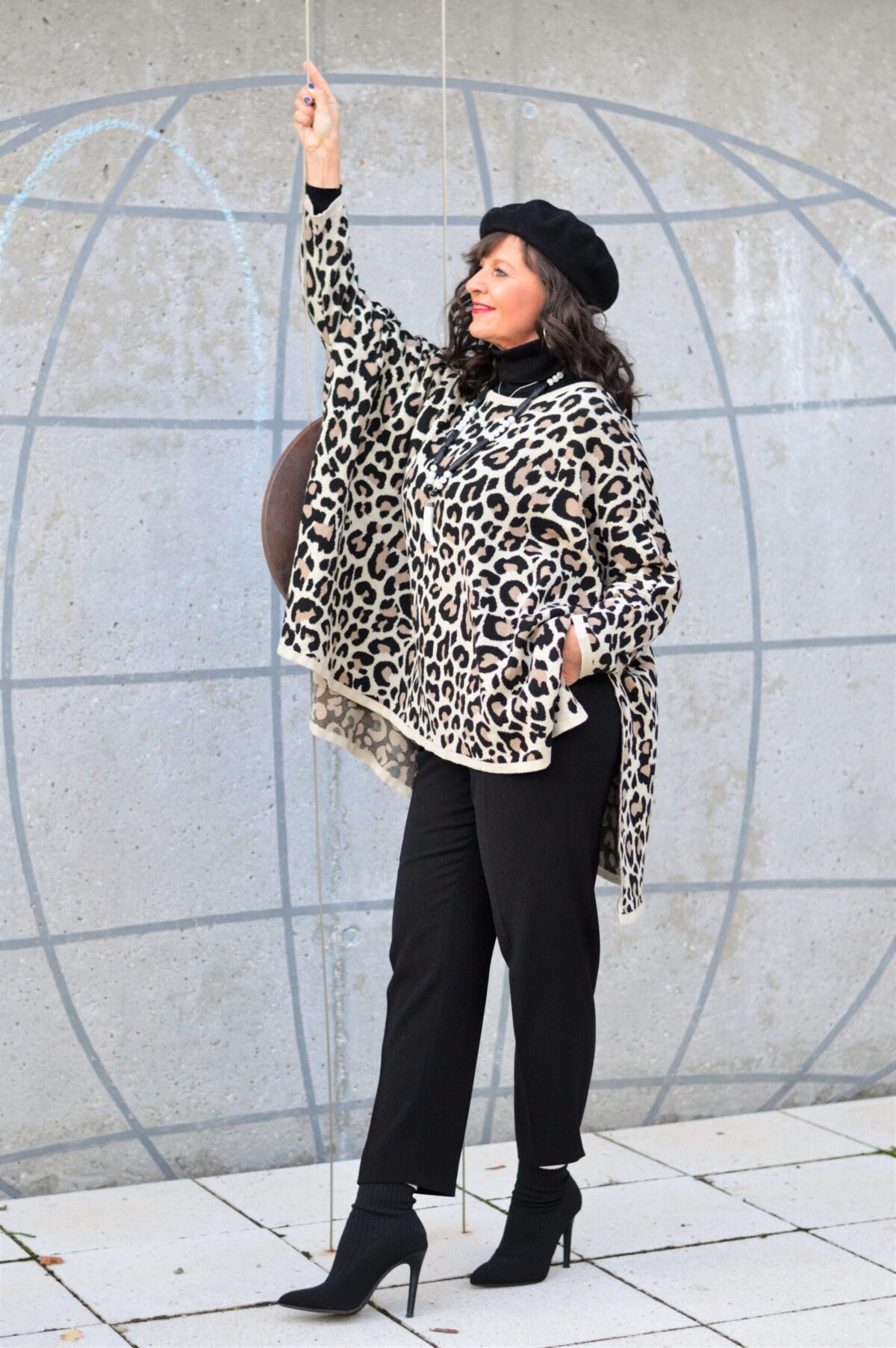 Der Animalprint-Poncho, den ich schon länger habe, ist das Herzstück dieses Outfits. Er bringt Dynamik, Selbstbewusstsein und eine Prise Extravaganz in den Look.