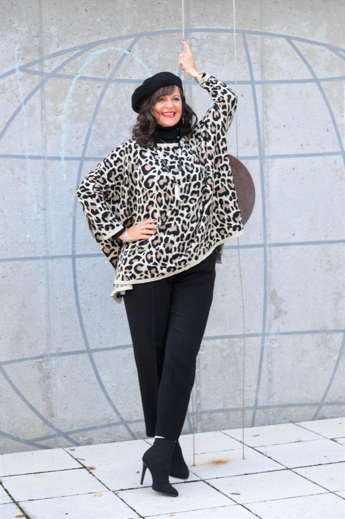 Dieses Outfit ist ein Beispiel dafür, wie Mode mit Persönlichkeit und Lebensfreude kombiniert werden kann. Der Animalprint-Poncho bringt Energie, die Baskenmütze Eleganz. Zusammen ergeben sie einen Look, der sowohl auffällig als auch tragbar ist. Mit den richtigen Styling- und Schminktipps wird daraus ein herbstlicher Lieblingslook für Frauen 50plus, die wissen was sie wollen.