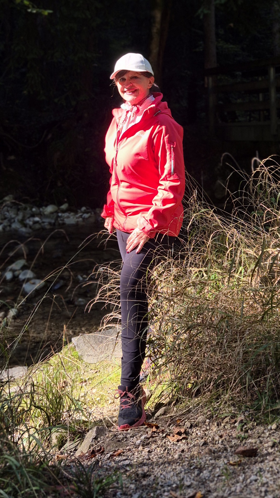 Mein Tipp: leichte, atmungsaktive Modelle mit rutschfester Sohle – perfekt für Waldwege und leichtes Gelände. Zusätzlich die richtigen Laufsocken. - Outfit: Ich trage atmungsaktive Kleidung in durchaus kräftigen Farben in der Outdoor-Jacke, kombiniert mit einem Cap. Wichtig ist, dass die Kleidung Bewegungsfreiheit bietet und dem Wetter angepasst ist – und dabei trotzdem „Lady 50plus“ ausstrahlt.