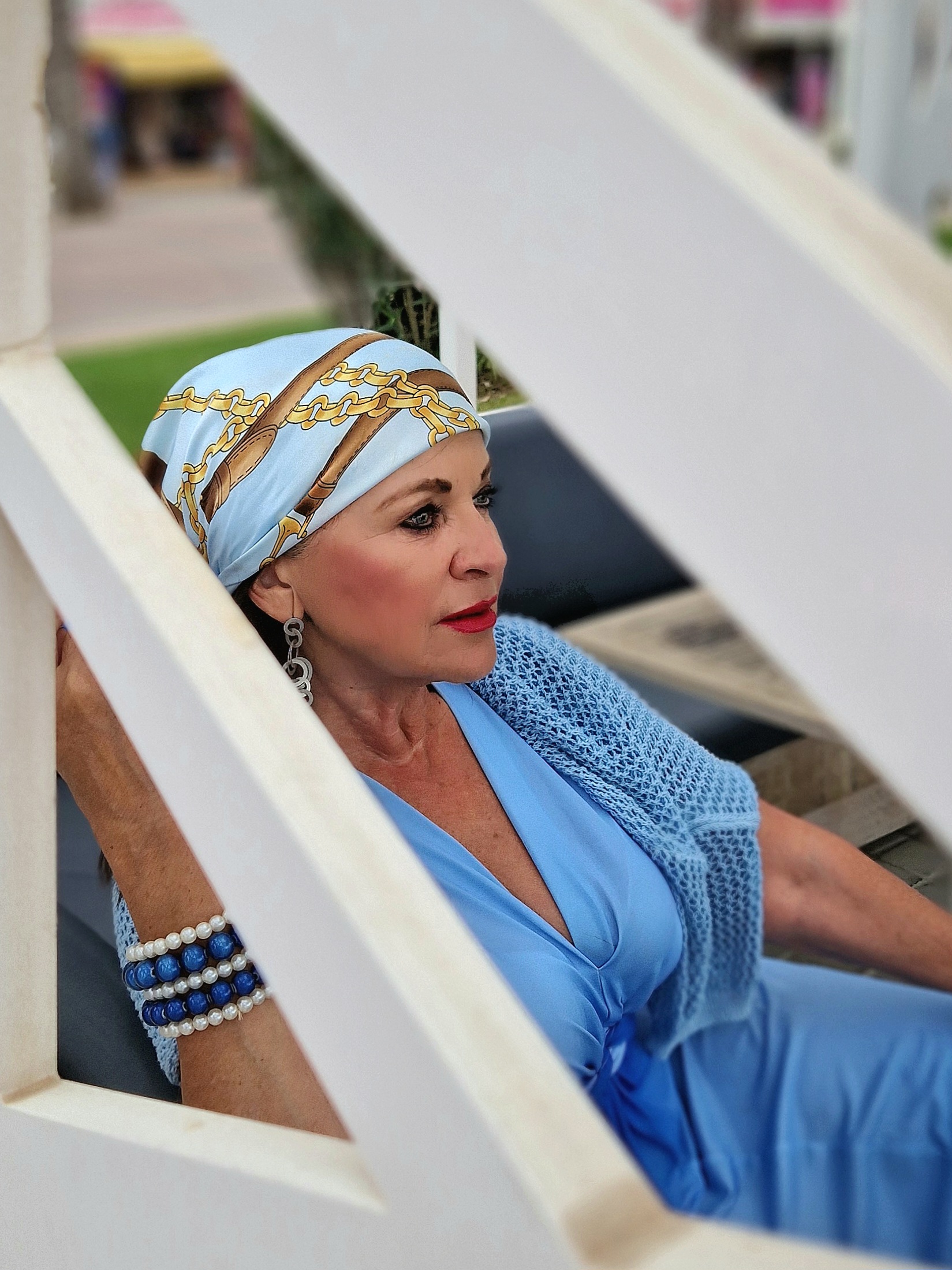 Als Statement trage ich dazu ein farblich abgestimmtes Kopftuch – nicht nur stilvoll, sondern auch praktisch an windigen Tagen. Es ersetzt das große Frisurenstyling und verleiht dem Look eine mediterrane Note mit Persönlichkeit.
