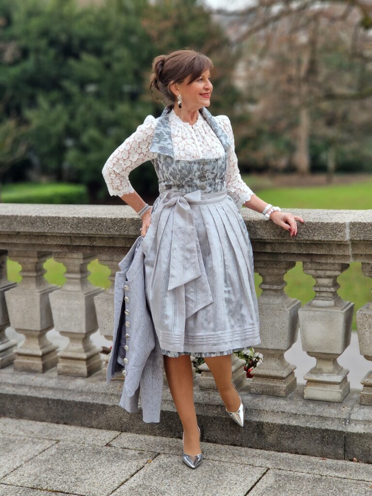 Es ist mein Weihnachtsdirndl! Am Heiligen Abend darf es besonders festlich sein. Mein silberfarbenes Dirndl ist ein Designer Dirndl und ich trage es hauptsächlich an Festtagen.