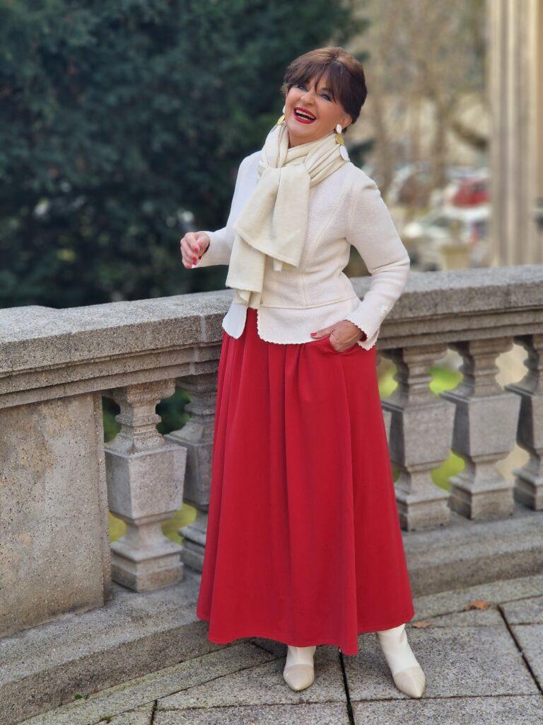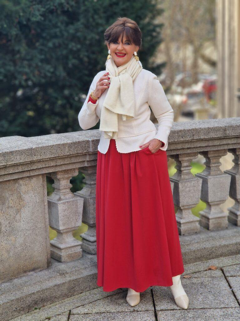 Ein Maxikleid in ROT ist der Inbegriff von Weihnachtsstimmung. Ich kombiniere es mit einen cremefarbigen Trachtenjanker, einem kuscheligen Kaschmirschal und passenden Accessoires, wie große Ohrringe, helle Tasche und helle Stiefel.