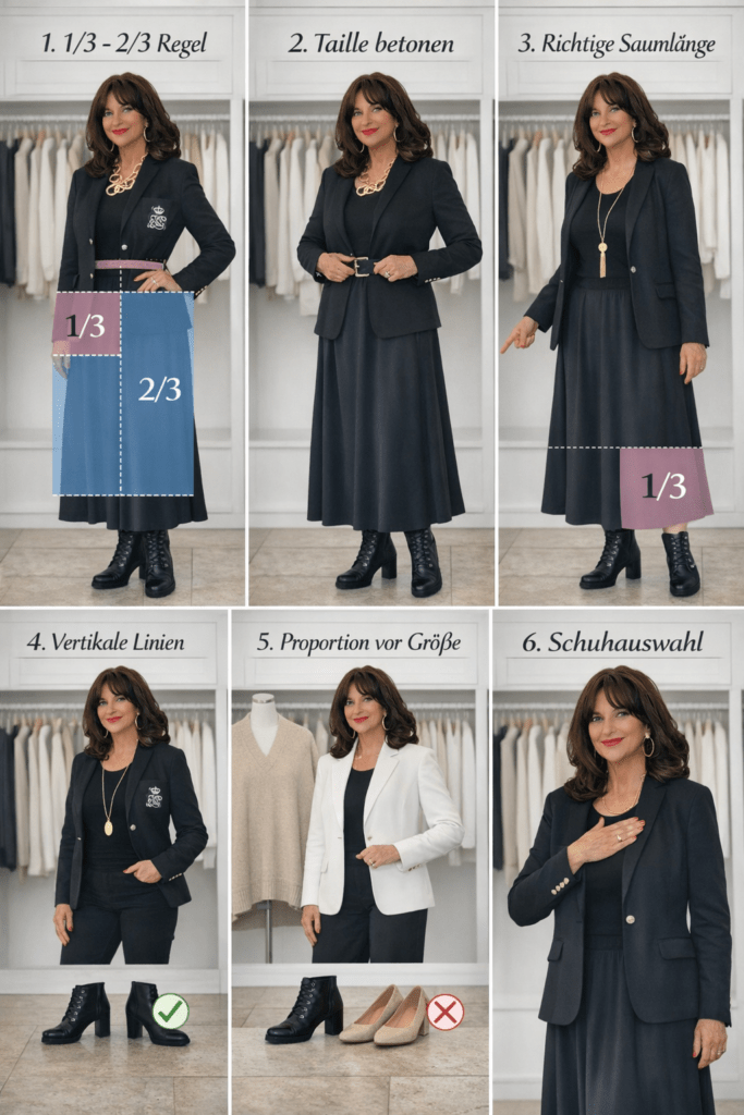 Die 1/3 zu 2/3 ist für mich sehr hilfreich und es entsteht ein harmonischer Gesamteindruck. Gürtel und Halsketten setze ich auch gezielt ein, auch ein Tipp von dir. Auf die Saumlänge achten, ein wertvoller Tipp, denn es macht den Look kaputt, wenn der an der falschen Stelle endet.