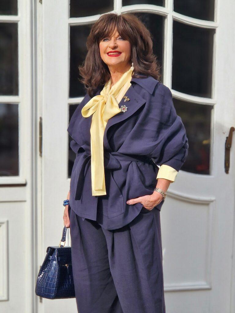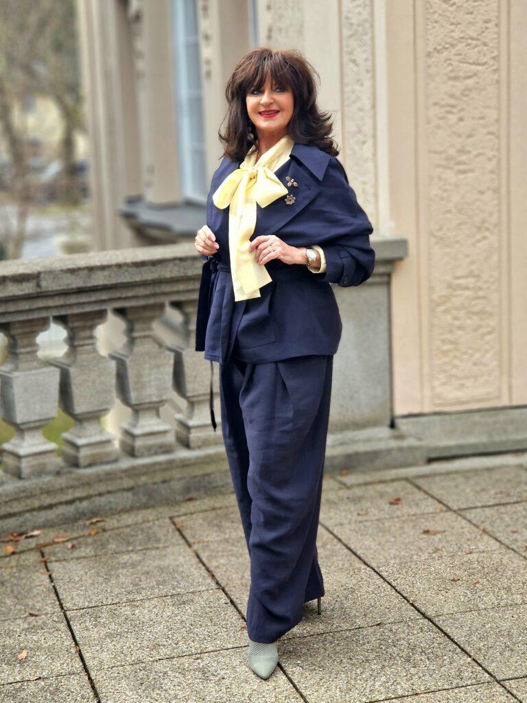 Ein dunkelblauer Hosenanzug ist ein Klassiker, aber in dieser modernen Schnittführung wird er zum Fashion Statement. Die Kombination mit einer zitronengelben Schluppenbluse zeigt – Mut zur Farbe!