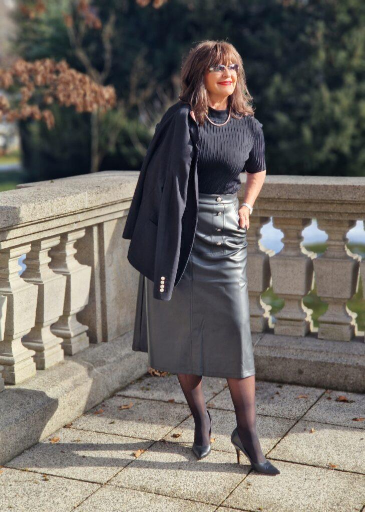 Ein schwarzer Lederimitat-Rock in A-Linie ist ein echtes Multitalent. Mit einem beigen Blazer wirkt er feminin und weich, mit einem schwarzen Blazer modern und souverän. Mit einem Bouclé-Blazer ist die Wirkung des Outfits eher elegant und leicht französisch inspiriert. Dazu der dünne Rolli, die Pumps, die Strümpfe – und schon hast Du drei Looks, die Dich stilvoll durch den Alltag, das Büro und sogar zur Abendveranstaltung begleiten.