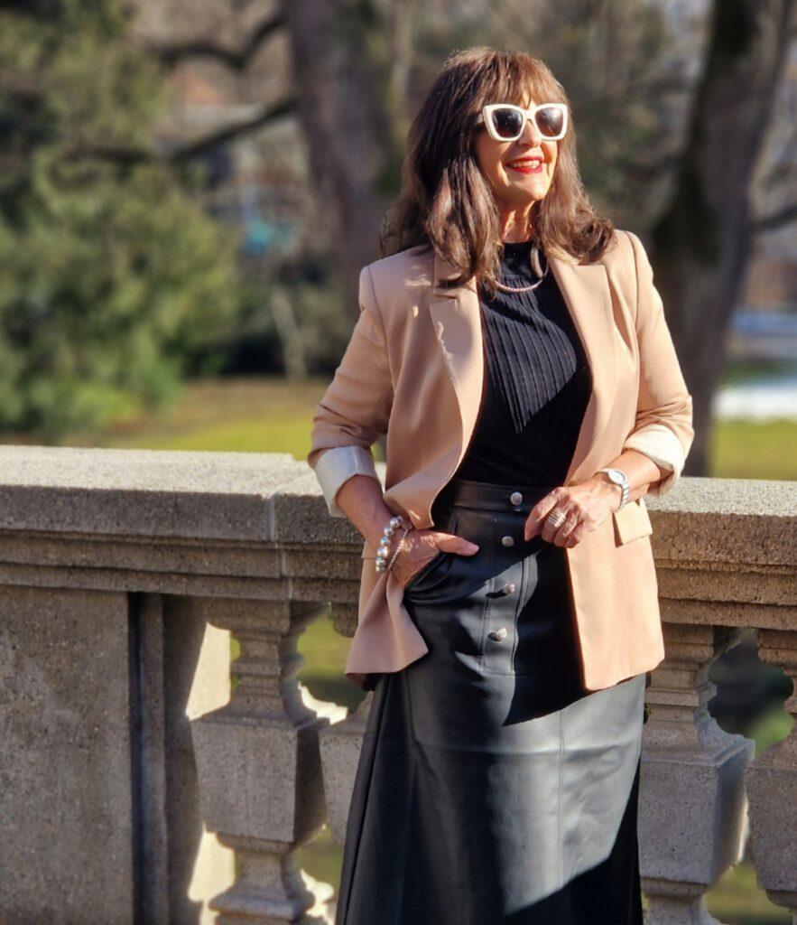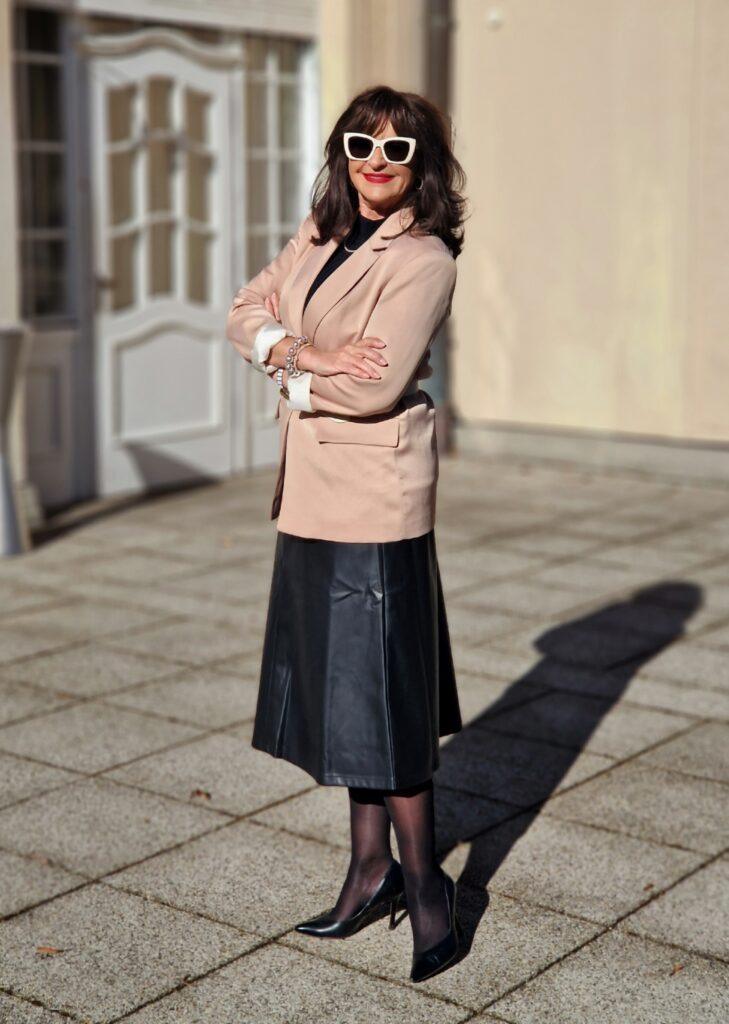 Ein beiger Blazer mit Gürtel ist ein echtes Statement-Piece. Er bringt Struktur ins Outfit, formt die Taille und verleiht dem Lederimitat-Rock eine weiche, feminine Note. Beige und Schwarz sind ein unschlagbares Duo – stilvoll, zeitlos und zu vielen Anlässen genau der richtige Look.