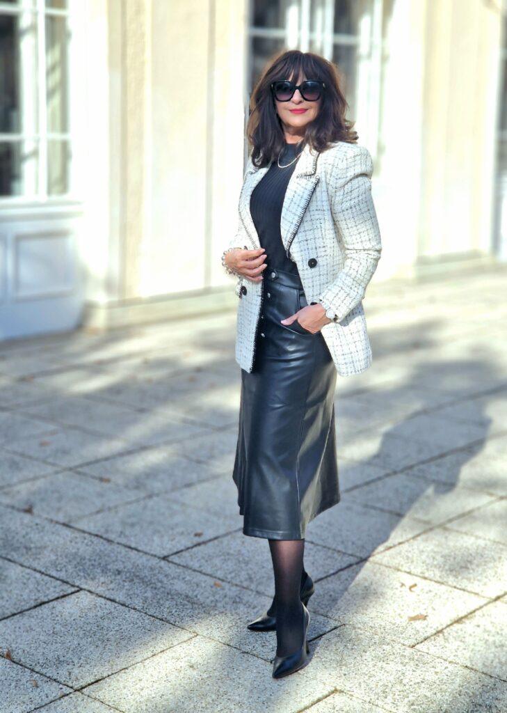 Bouclé ist ein Klassiker, der nie aus der Mode kommt. Ein Bouclé-Blazer in zartem Schwarz-Weiß bringt Struktur, Eleganz und eine Prise Chanel-Flair in das Outfit. Gerade in Kombination mit dem Lederimitat-Rock entsteht ein spannender Mix. Ein Hauch von klassischem Chic kombiniert mit modernem Outfit.