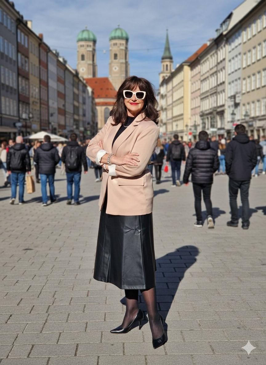 Ein beiger Blazer mit Gürtel ist ein echtes Statement-Piece. Er bringt Struktur ins Outfit, formt die Taille und verleiht dem Lederimitat-Rock eine weiche, feminine Note. Beige und Schwarz sind ein unschlagbares Duo – stilvoll, zeitlos und zu vielen Anlässen genau der richtige Look.