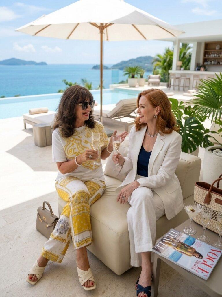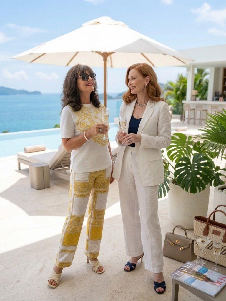 - Ein pinkes Cashmere‑Tuch macht den Look sofort edler und ist ideal, wenn am Abend eine leichte Brise aufkommt. Es wirkt weicher als ein Blazer und verleiht dem Outfit eine feminine Note.