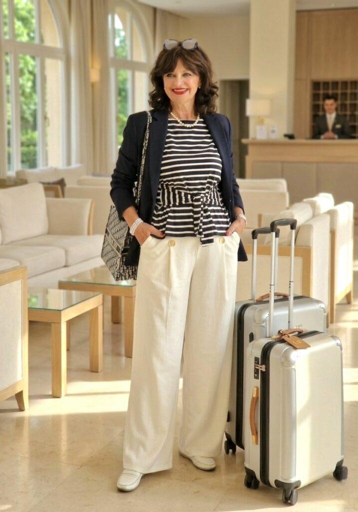 Für die Rückreise setze ich immer auf Komfort mit Stil. Mein gestreiftes Shirt, die weite Hose und der dunkelblaue Blazer sind die perfekte Kombination aus lässig und elegant. Dazu bequeme Schuhe – und schon fühlt man sich auch auf Reisen gut angezogen.
