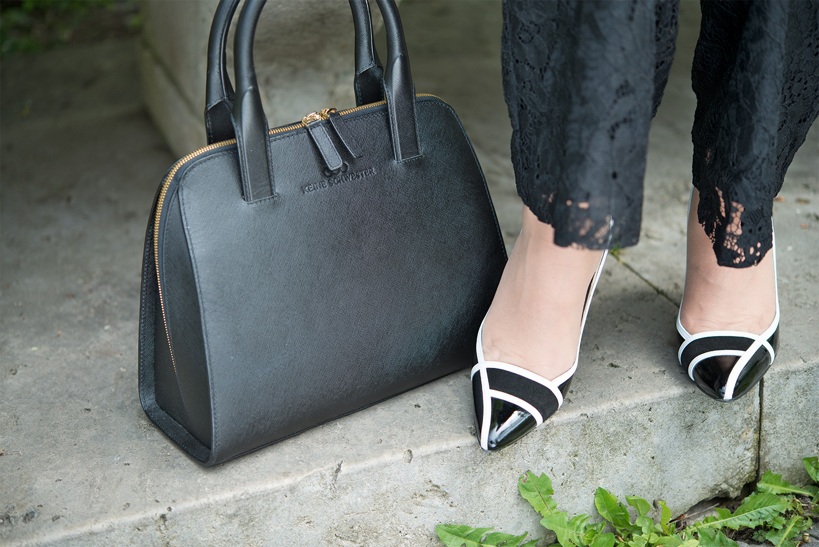 Mit den richtigen Accessoires und einem glamourösen Make up kann ich mein Outfit sogar für einen Besuch in der Oper tragen. Eine schwarze Handtasche mit passenden Schuhen und der auffälligen Kette geben den Look den Glam-Effekt.