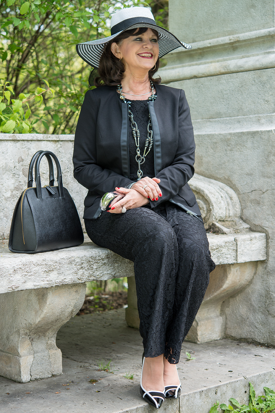 Der Jumpsuit in Spitze sieht wirklich gut aus und in Schwarz steht er dir sehr gut, es ist mal ein besonderer Look. Für mich würde ich einen in Dunkelblau wählen und dazu auch einen dunkelblauen Blazer. Einen weißen Blazer hätte ich auch. Der Hut passt auch super dazu, ich allerdings bin bei Hüten sehr zurückhaltend.
